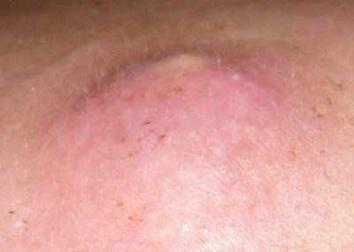 - На первом этапе происходит инфильтрация вокруг устья пораженного фолликула. Постепенно инфильтрат (сгусток крови и жидкости лимфы) увеличивается в размерах, уплотняется и становится болезненным. Ткани вокруг отекают, возникает чувство покалывания.
